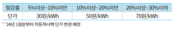 기본캐시백은 최소 절감률 3%와 동일지역 참여자 평균 절감률 이상을 달성한 경우이며, 절감량 1kWh당 30원을 지급합니다. 단, 최대 절감률 30% 한도입니다. 차등캐시백은 평균 절감률과 상관없이 절감률 5% 이상 달성 시 30% 한도 내 구간별로 1kWh당 30~70원 차등 지급합니다.